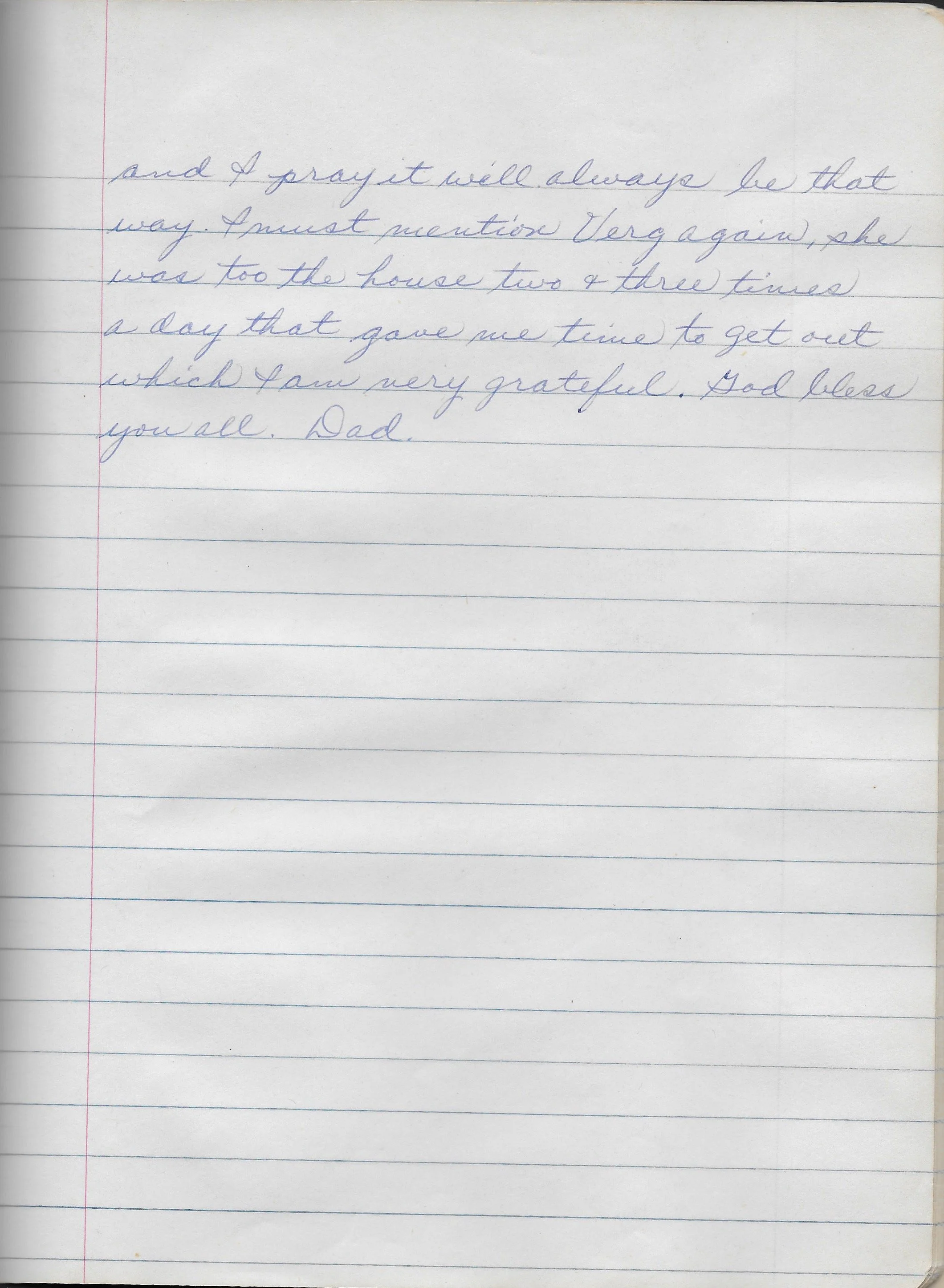 and I pray it will always be that way. I must mention Virg again, she was too the house two & three times a day that gave me time to get out which I am very grateful. God bless you all. Dad.