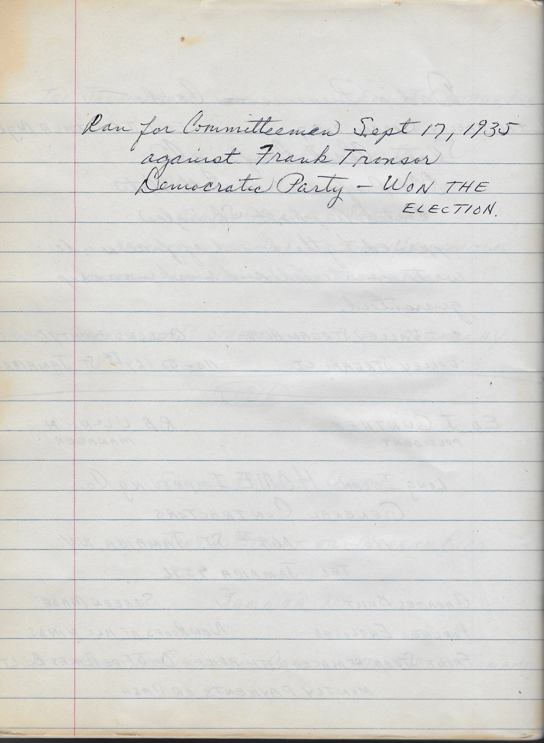 Appendix 30 Jun 4 Written By Rob Gunther Ran for Committeeman Sept 17, 1935 against Frank TronsorDemocratic Party - WON THE ELECTION Rob Gunther