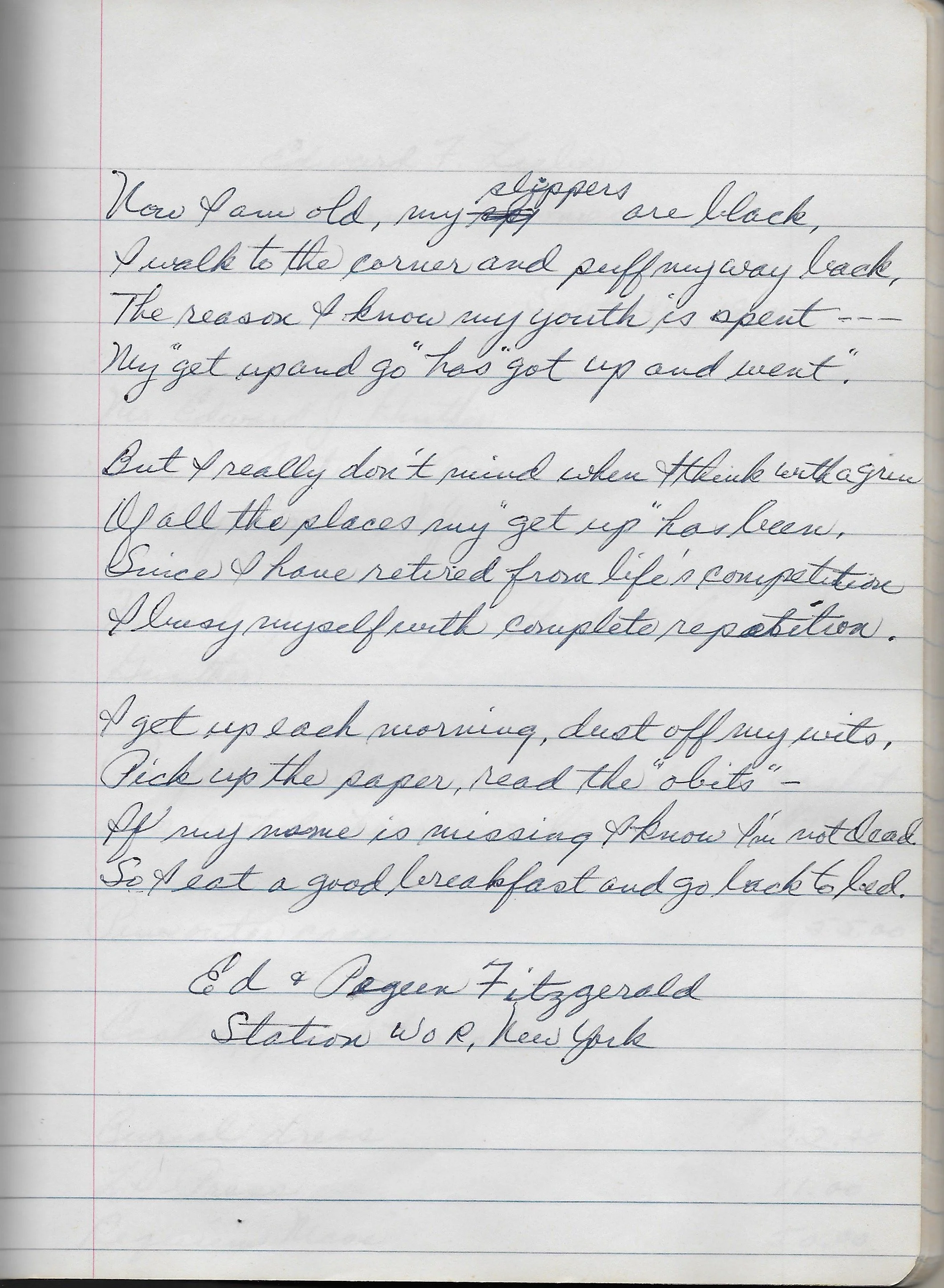 Now I am old, my slippers are black, I walk to the corner and puff my way back, The reason I know my youth is spent, My “get up and go” has “got up and went.”