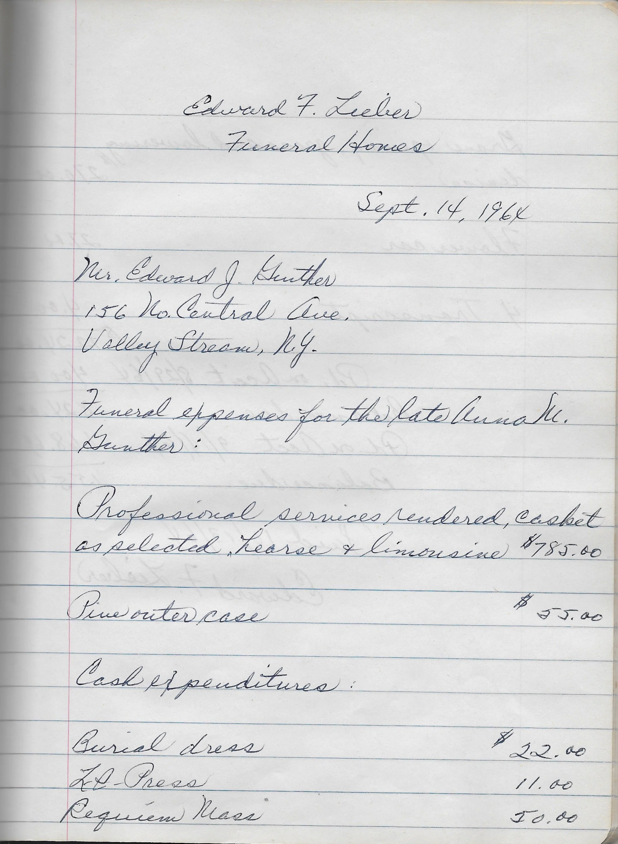 Funeral expenses for the late Anna M. Gunther: