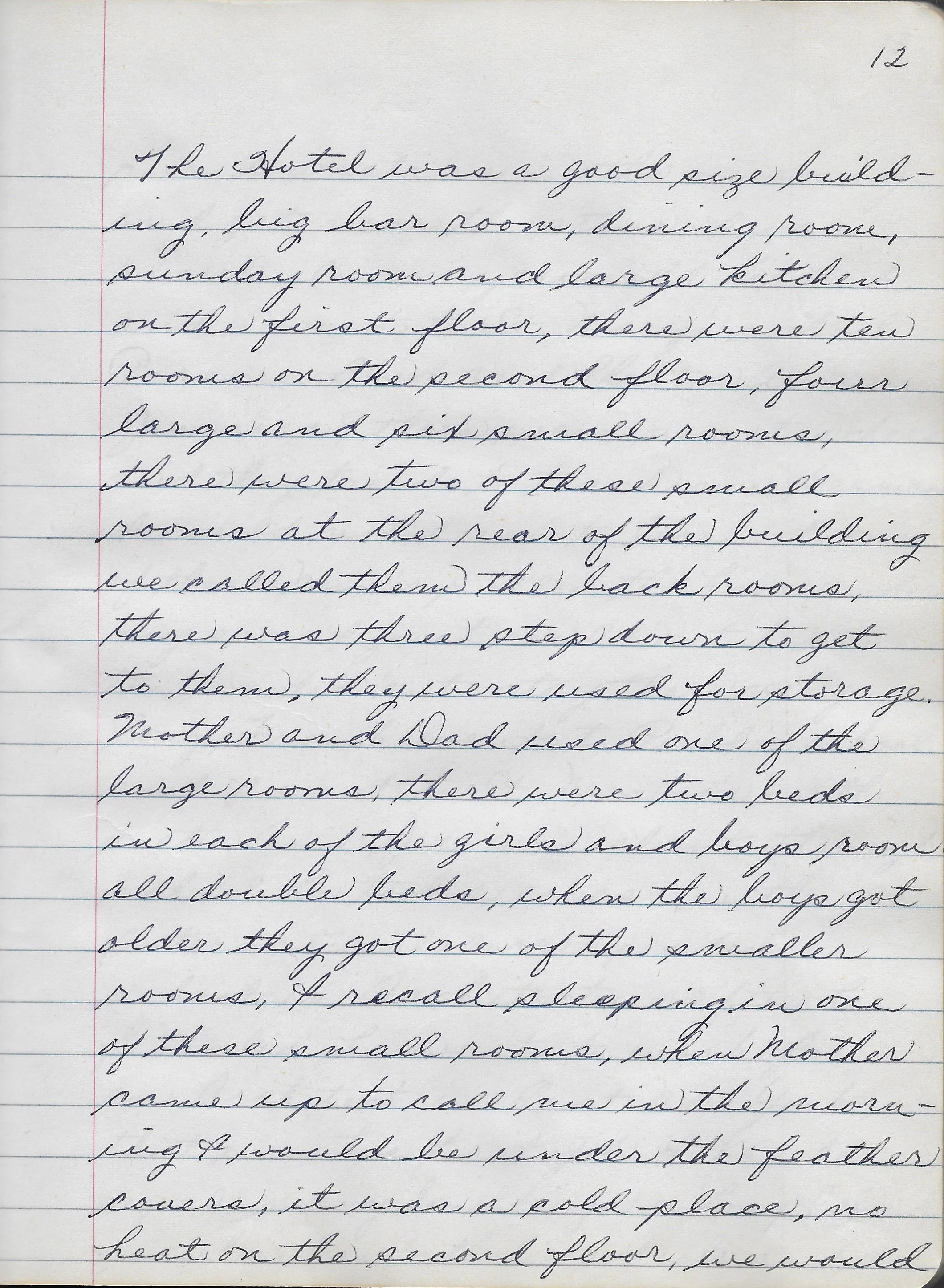 The Hotel was a good size building, big bar room, dining room, Sunday room and large kitchen on the first floor, there were ten rooms on the second floor, four large and six small rooms, there were two of these small rooms at the rear of the building we called them the back rooms, there was three step down to get to them, they were used for storage. Mother and Dad used one of the large rooms, there were two beds in each of the girls and boys room all double beds, when the boys got older the they got one of the smaller rooms, I recall sleeping in one of these small rooms, when mother came up to call me in the morning I would be under the feather covers, it was a cold place, no heat on the second floor, we would