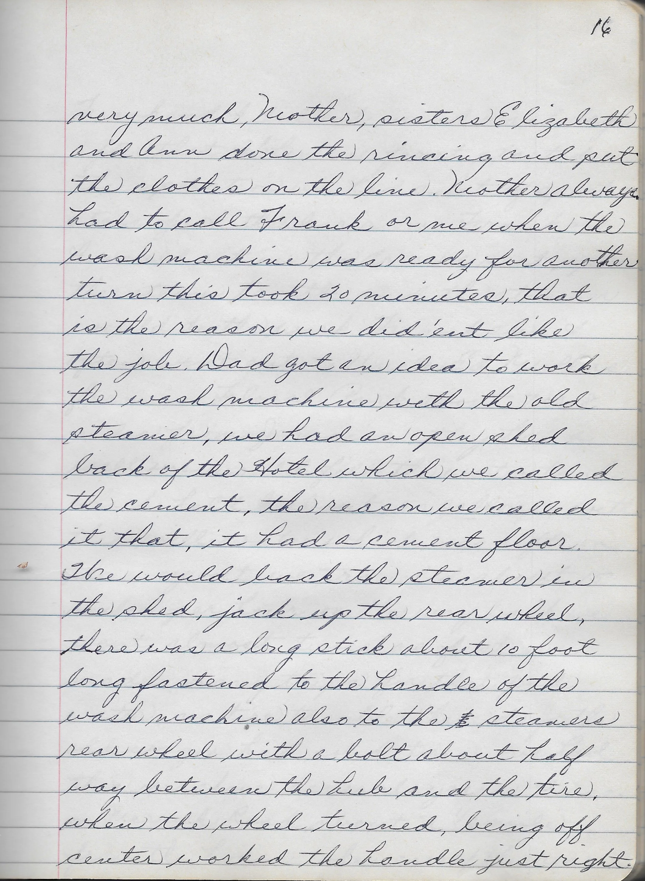 very much, mother, sisters Elizabeth and Ann done the rinsing and put the clothes on the line. Mother always had to call Frank or me when the wash machine was ready for another turn this took 20 minutes, that is the reason we didn't like the job. Dad got an idea to work the wash machine with the old steamer, we had an open shed back of the Hotel which we called the cement, the reason we called it that, it had a cement floor. We would back the steamer in the shed, jack up the rear wheel, there was a long stick about 10 foot long fastened to the handle of the wash machine also to the steamers rear wheel with a bolt about half way between the tub and the tire, when the wheel turned, being off center worked the handle just right.