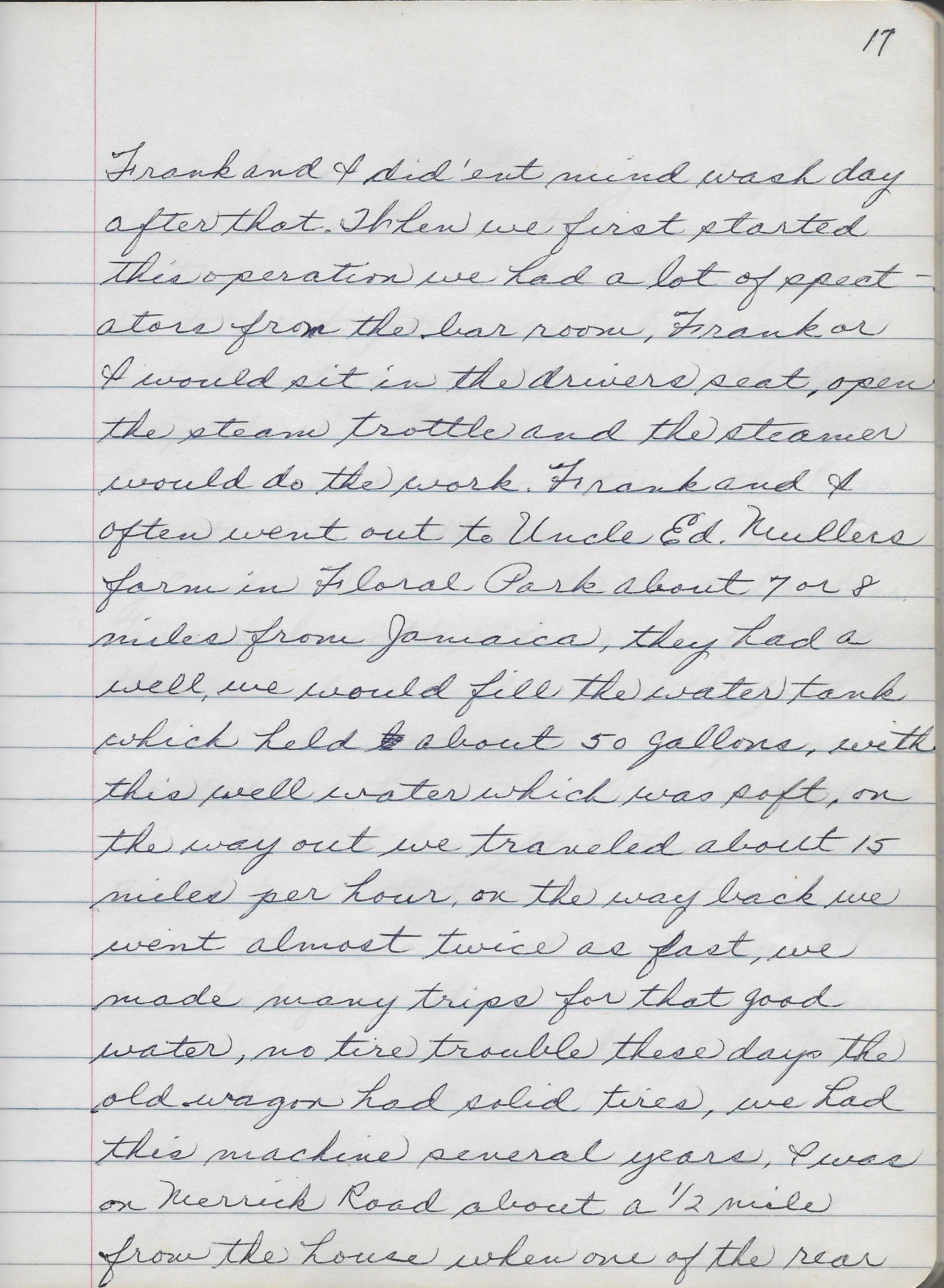 Frank and I didn’t mind wash day after that. When we first started this operation we had a lot of spectators from the bar room, Frank or I would sit in the drivers seat, open the steam throttle and the steamer would do the work. Frank and I often went out to Uncle Ed Mullers farm in Floral Park about 7 or 8 miles from Jamaica, they had a well, we would fill the water tank which held about 50 gallons, with this well water which was soft, on the way out we traveled about 15 miles per hour, on the way back we went almost twice as fast, we made many trips for that good water, no tire trouble these days, the old wagon had solid tires, we had this machine several years, I was on Merrick Road about a 1/2 mile from the house when one of the rear