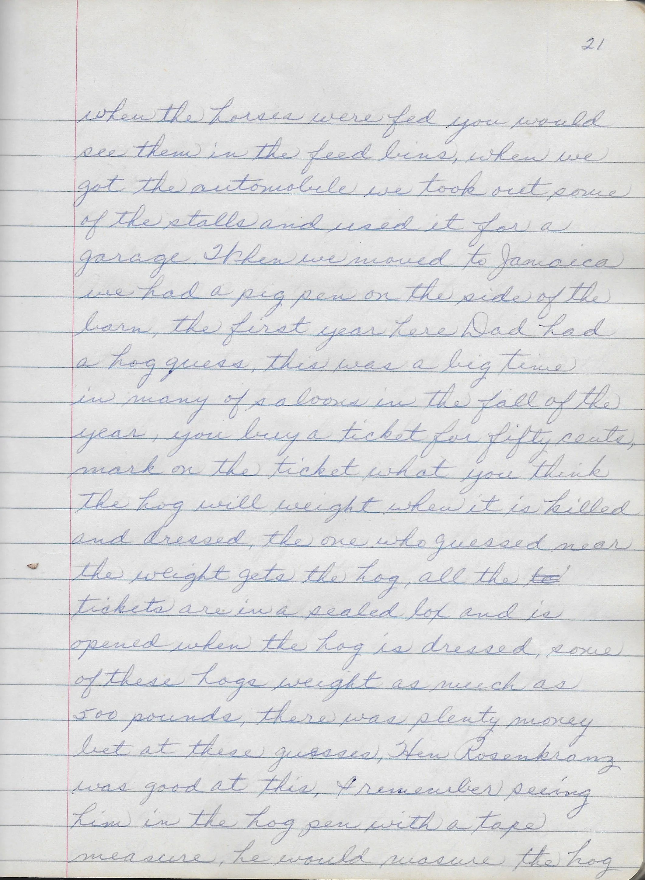 when the horses were fed you would see them in the feed bins, when we got the automobile we took out some of the stalls and used it for a garage. When we moved to Jamaica we had a pig pen on the side of the barn, the first year here Dad had a hog guess, this was a big time in many of saloons in the fall of the year, you buy a ticket for fifty cents, mark on the ticket what you think the hog will weight when it is killed and dressed, the one who guessed near the weight gets the hog, all the tickets are in a sealed box and is opened when the hog is dressed, some of these hogs weight as much as 500 pounds, there was plenty money bet at these guesses, Ken Rosenkranz was good at this, I remember seeing him in the hog pen with a tape measure, he would pursuer the hog