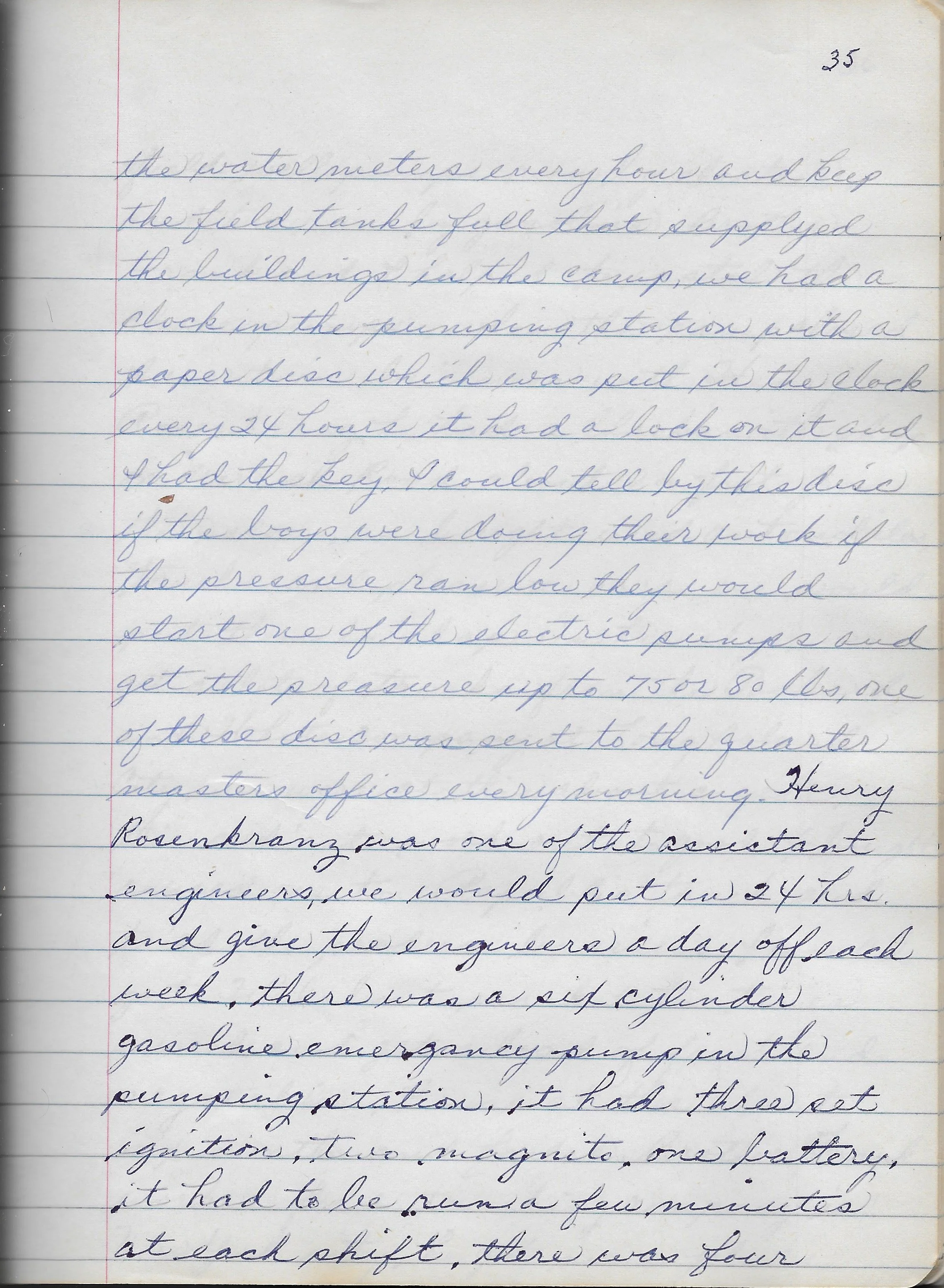 the water meters every hour and keep the field tanks full that supplied the buildings in the camp, we had a clock in the pumping station with a paper disc which was put in the clock 24 hours it had a lock on it and I had the key, I could tell by this disc if the boys were doing their work if the pressure ran low the they would start one of the electric pumps and get the pressure up to 75 or 80 lbs, one of these discs was sent to the quarter masters office every morning. Henry Rosenkranz was one of the resistant engineers, we would put in 24 hrs. and give the engineers a day off each week, there was a six cylinder gasoline emergency pump in the pumping station, it had three set ignition, two magnite, one battery, it had to be run a few minutes each shift, there was four