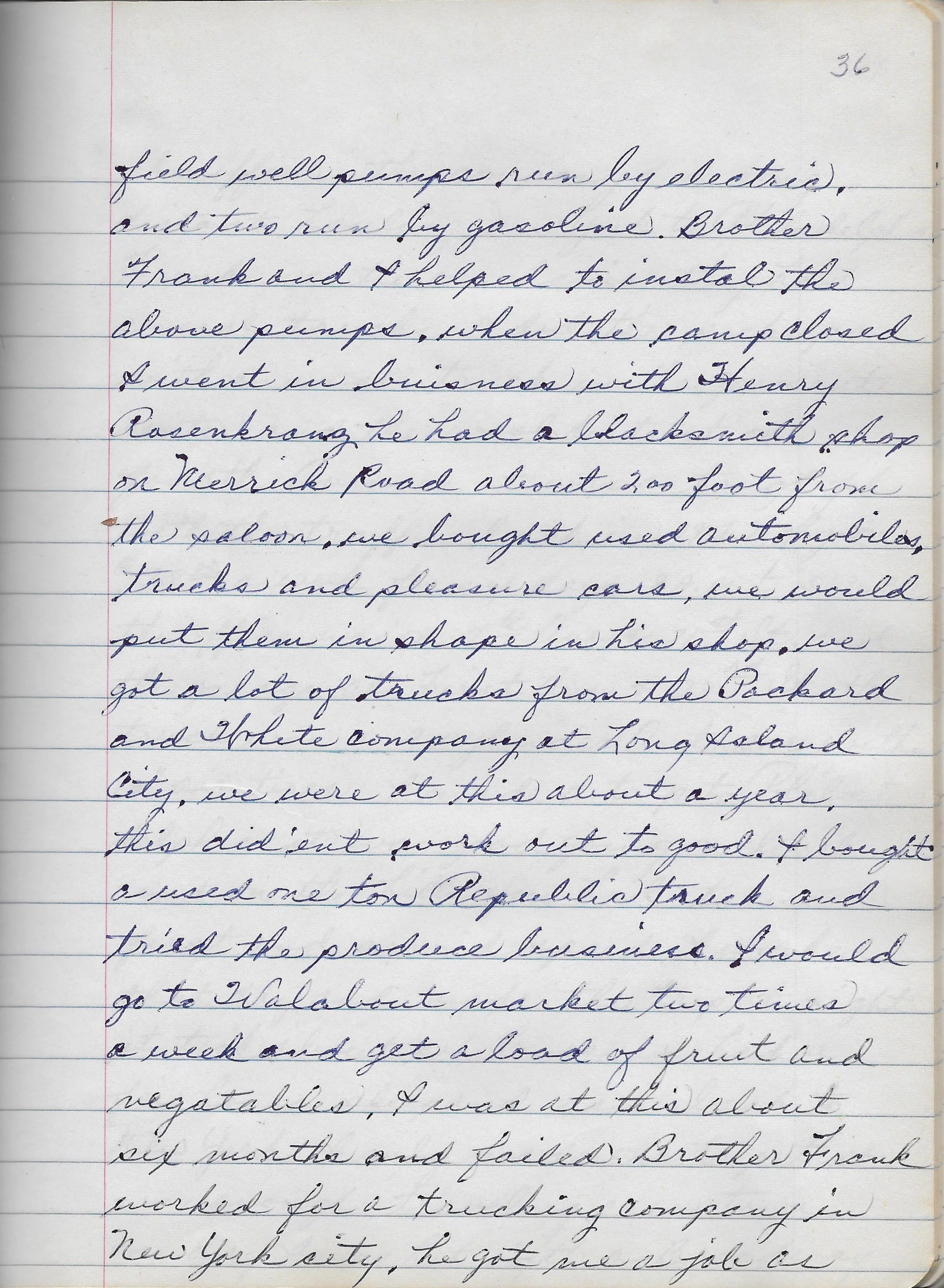 field well pumps run by electric, and two run by gasoline. Brother Frank and I helped to instal the above pumps, when the camp closed I went in business with Henry Rosenkranz he had a blacksmith shop on Merrick Road about 200 foot from the saloon, we bought used automobiles, trucks and pleasure cars, we would put them in shape in his shop, we got a lot of trucks from the Packard and White company at Long Island City, we were at this about a year, this didn’t work out to good. I bought a used one ton Republic truck and tried the produce business. I would go to Walabout market two times a week and get a load of fruit and vegetables, I was at this about six months and failed. Brother Frank worked for a trucking company in New York City, he got sue a job as