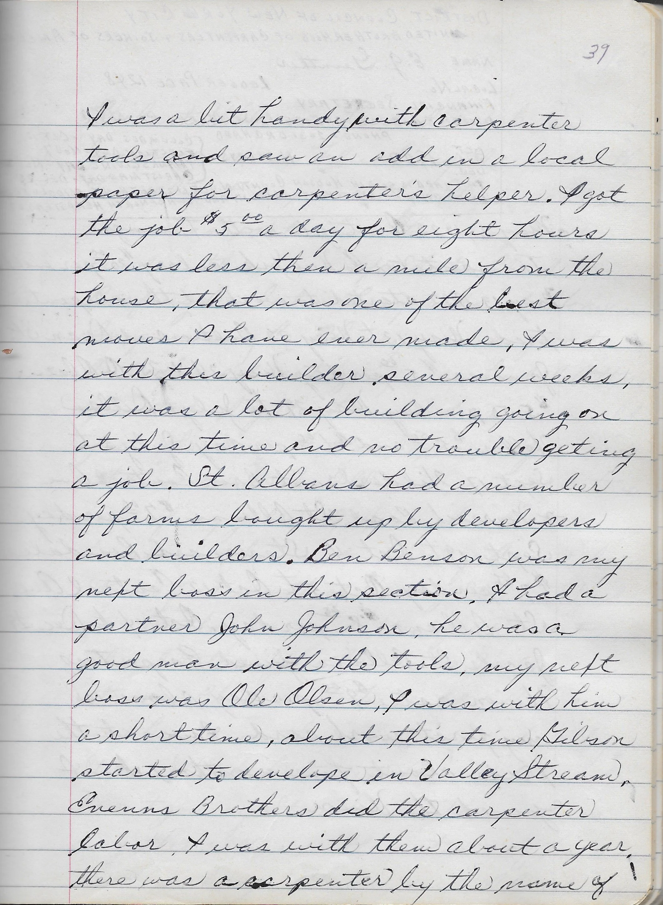 I was a bit handy with carpenter tools and saw an add in a local paper for carpenter's helper. I got the job $500 a day for eight hours it was less than a mile from the house, that was one of the best moves I have ever made, I was with this builder several weeks, it was a lot of building going on at this time and no trouble geting a job. St. Albans had a number of farms bought up by developers and builders. Ben Benson was my next boss in this sector, I had a partner John Johnson, he was a good man with the tools, my left base Ole Olsen, I was with him a short time, about this time Gibson started to develop in Valley Stream. Evenns Brothers did the carpenter labor, I was with them about a year. there was a carpenter by the name of