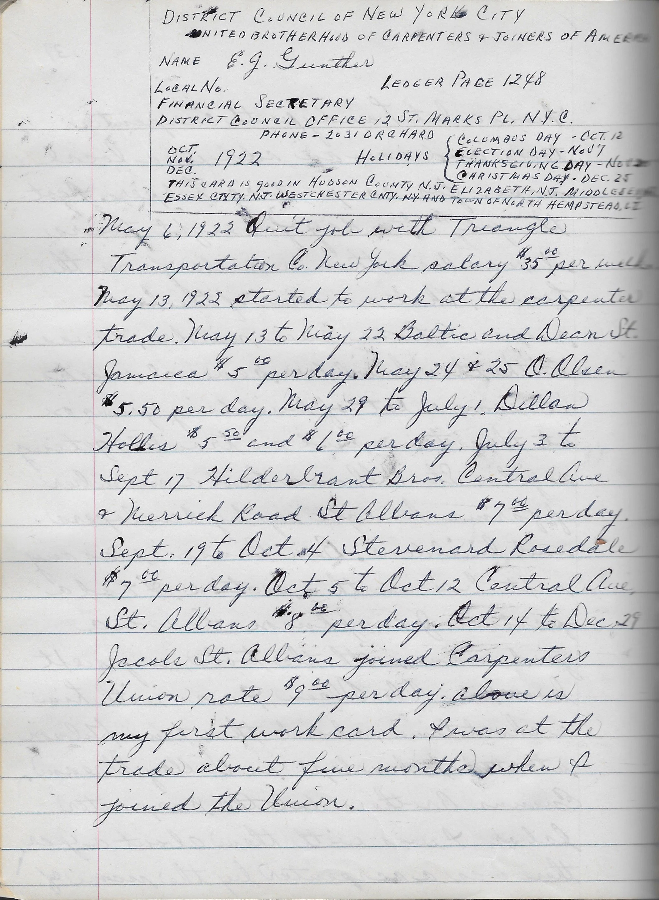 May 6, 1922 Quit job with Triangle Transportation Co. New York salary $35 per month May 13, 1922 started to work at the carpenter trade. May 13 to May 22 Baltic and Dean St. Jamaica $5.00 per day. May 29 to July 1, Dillan Hollis $5.50 and $6 per day, July 3 to Sept 17 Hilderbrant Bros. Central Ave & Merrick Road St Albans $7 per day. Sept. 19 to Oct 4 Stevenard Rosedale $7 per day. Oct 5 to Oct 12 Central Ave. St. Albans $8 per day. Oct 14. to Dec 29 Jacobs St. Albans joined Carpenters Union rate $9 per day, above is my first work card. I was at the trade about five months when I joined the Union.