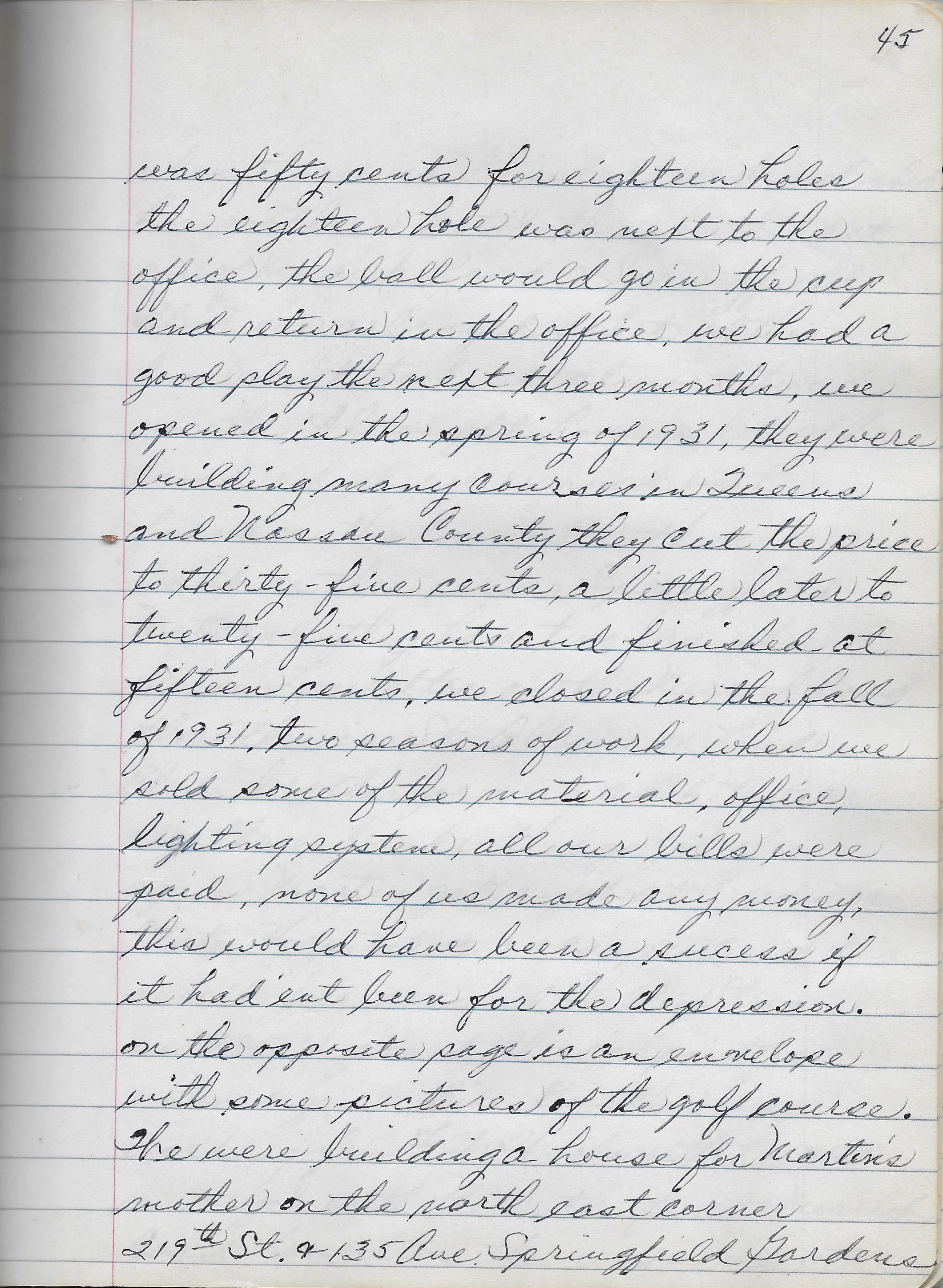 was fifty cents for eighteen holes the eighteen hole was next to the office, the ball would go in the cup and return in the office, we had a good play the next three months, we opened in the spring of 1931, they were building many courses in Queens and Nassau County, they cut the price to thirty-five cents, a little later to twenty-five cents and finished at fifteen cents, we closed in the fall of 1931, two seasons of work, when we sold some of the material, office, lighting system, all our bills were paid, none of us made any money, this would have been a success is it had hadn’t been for the depression, on the opposite page is an envelope with some pictures of the golf course. We were building a house for Martin’s mother on the north east corner, 219th St. & 135 Ave, Springfield Gardens