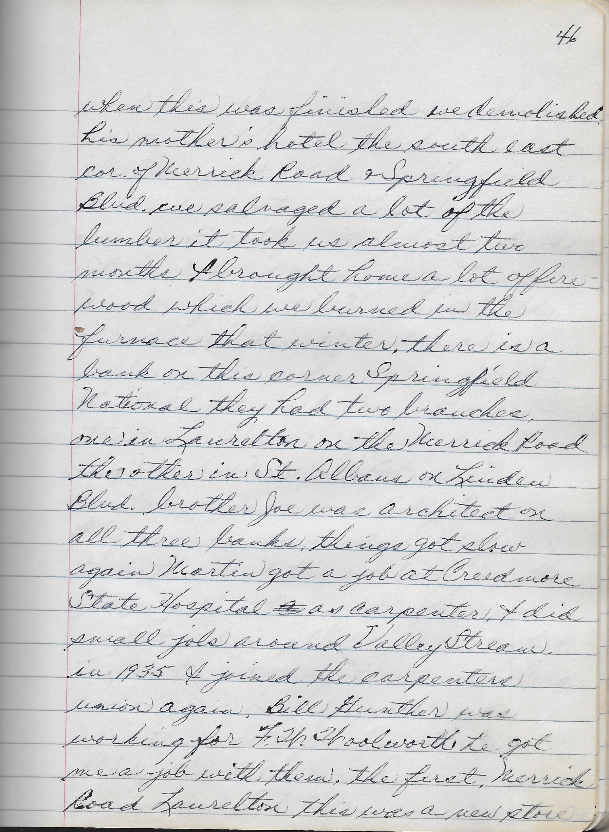 when this was finished we demolished his mother's hotel the south east corner of Merrick Road & Springfield Blvd, we salvaged a lot of the lumber it took us almost two months, I brought home a lot of firewood which we burned in the furnace that winter, there is a bank on this corner Springfield National they had two branches, one in Laurelton on the Merrick Road the other in St. Albans on Linden Blvd, brother Joe was architect on all three banks, things got slow again Martin got a job at Creedmore State Hospital as carpenter, I did small jols around Valley Stream, in 1935 I joined the carpenters union again, Bill Gunther was working for or F.W. Woolworth he got me a job with them, the first, Merrick Road Laurelton this was a new store