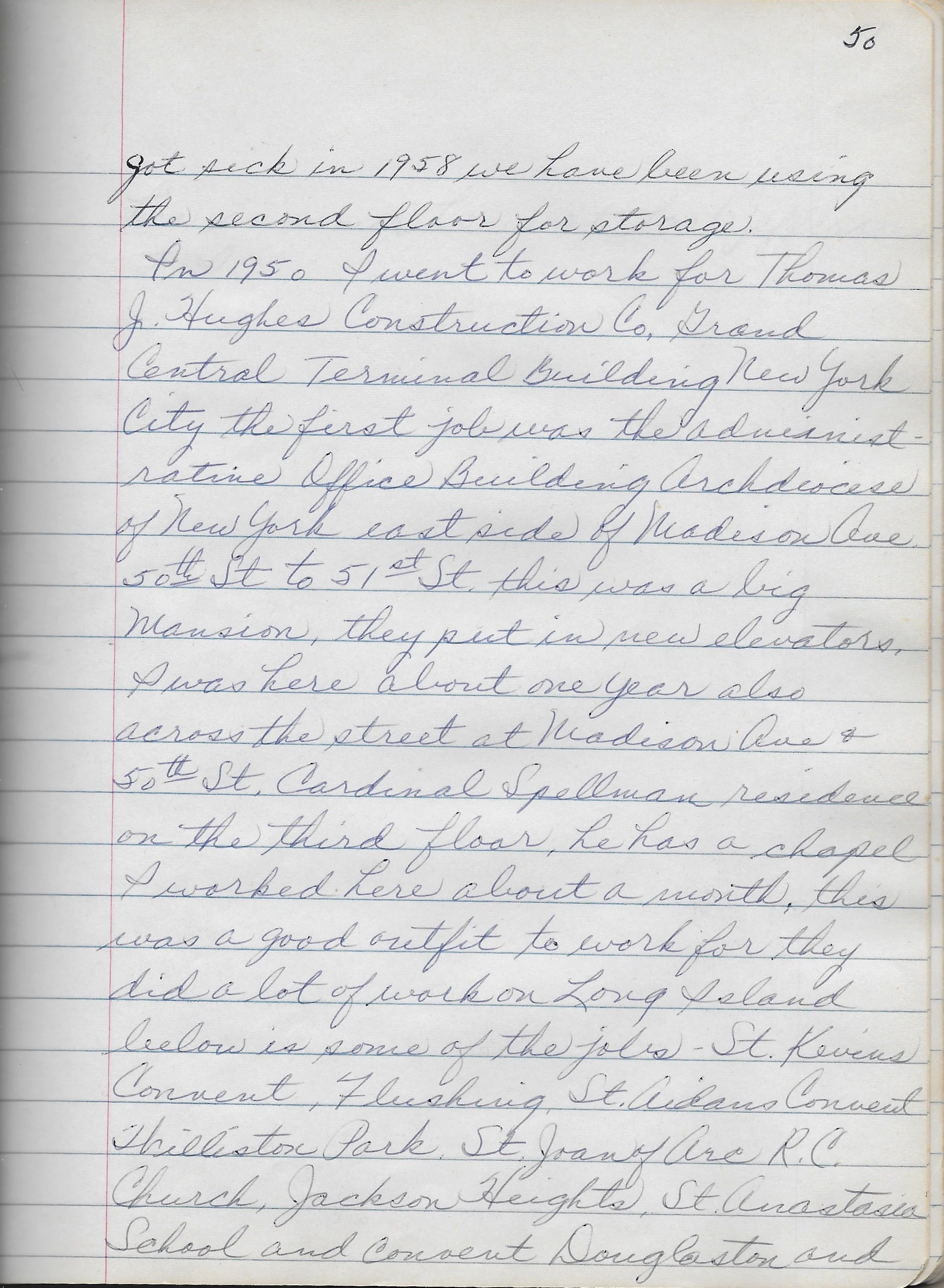 got sick in 1958 we have been using the second floor for storage. In 1950 I went to work for Thomas J. Hughes Construction Co, Grand Central Terminal Building New York City, the first job was the administration Office Building Archdiocese of New York east side of Madison Ave 50th St. to 51st St. this was a big mansion, they put in new elevators, I was here about one year also across the street at Madison Ave & 50th St. Cardinal Spellman residence on the third floor, he has a chapel I worked here about a month, this was a good outfit to work for they did a lot of work on Long Island below is some of the jobs - St. Kevins Convent, Flushing St. Aidan’s Convent, Williston Park, St. Joan of Arc, R.C. Church, Jackson Heights, St Anastasia School and Convent Douglaston and
