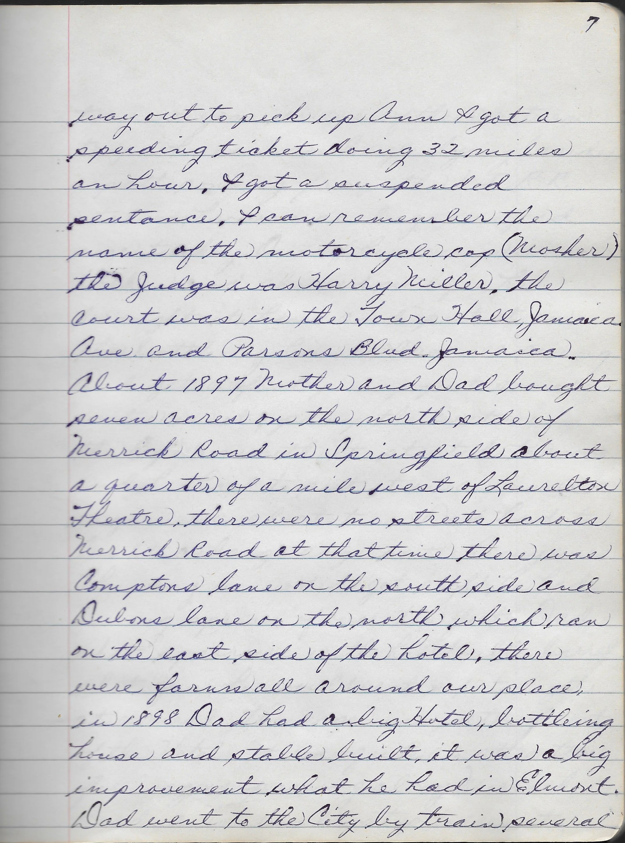 way out to pick up Ann I got a speeding ticket doing 32 miles an hour, I got a suspended sentence, I can remember the name of the motorcycle cop (Mosher) the Judge was Harry Miller, the Court was in the Town Hall, Jamaica Ave. and Parsons Blvd. Jamaica. About 1897 Mother and Dad bought seven acres on the north side of Merrick Road in Springfield about a quarter of a mile west of Laurelton Theatre, there were no streets across Merrick Road at that time there was Compton’s lane on the south side and Dubons lane on the north which ran on the east side of the hotel, there were farms all around our place, in 1898 Dad had a big Hotel, bottling house and stable built, it was a big improvement what he had in Elmont. Dad went to the City by train several